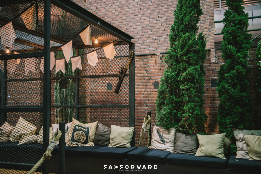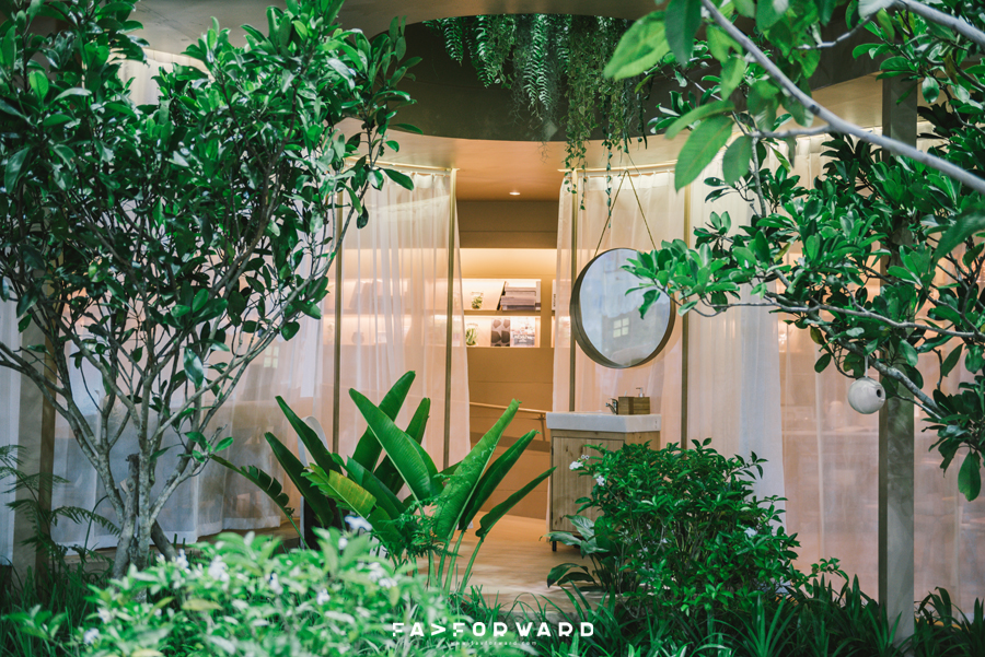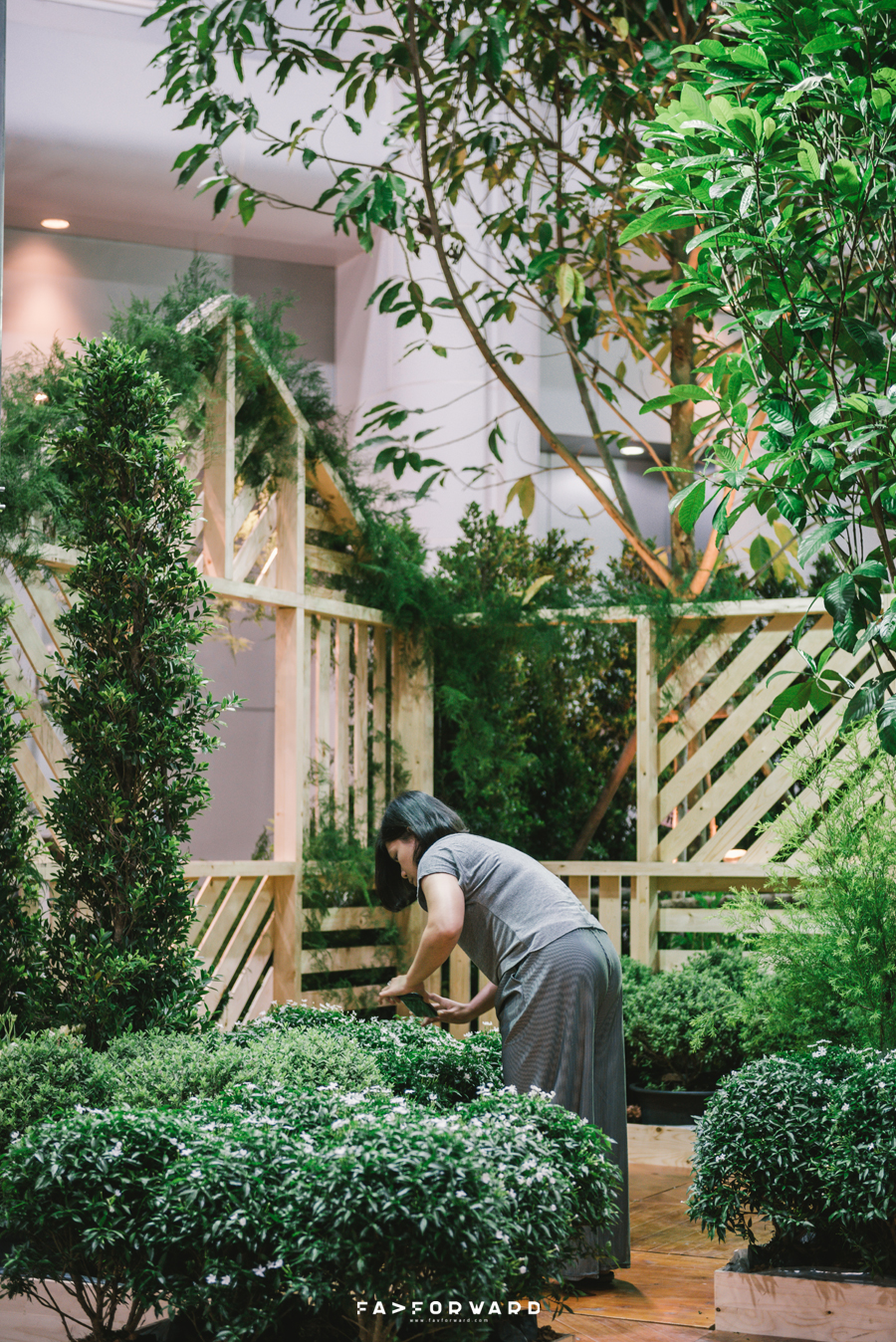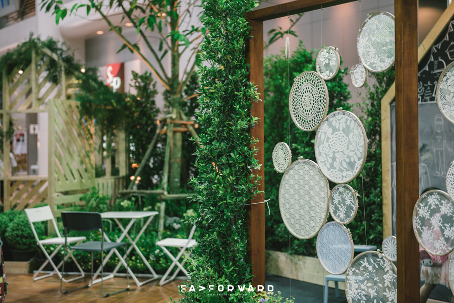 ด้านหน้าของสวนโชว์ โดดเด่นด้วยไม้ประดับสีเขียวสดชื่น พร้อมกับการต้อนรับเราด้วยเทอร์เรซไม้และเคาน์เตอร์บาร์