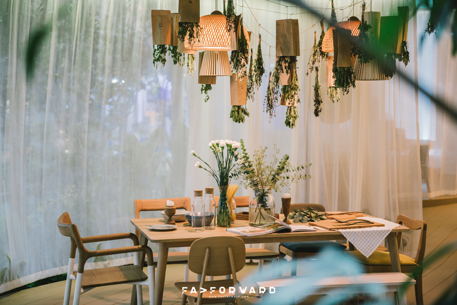 ใกล้กันคือห้องครัวที่โดดเด่นด้วยการใช้ดอกไม้แห้งมาประดับ โดยพื้นที่สวนใกล้ครัวยังปลูกผักสวนครัว ไม่ว่าจะเป็นถั่วฝักยาว พริกหยวก พริกขี้หนู และต้นมะเขือ ฯลฯ ที่นอกจากจะเด็ดมาทำมื้ออาหารแสนอร่อยแล้ว ยังเพิ่มความเขียวขจีให้บ้านอีกด้วย