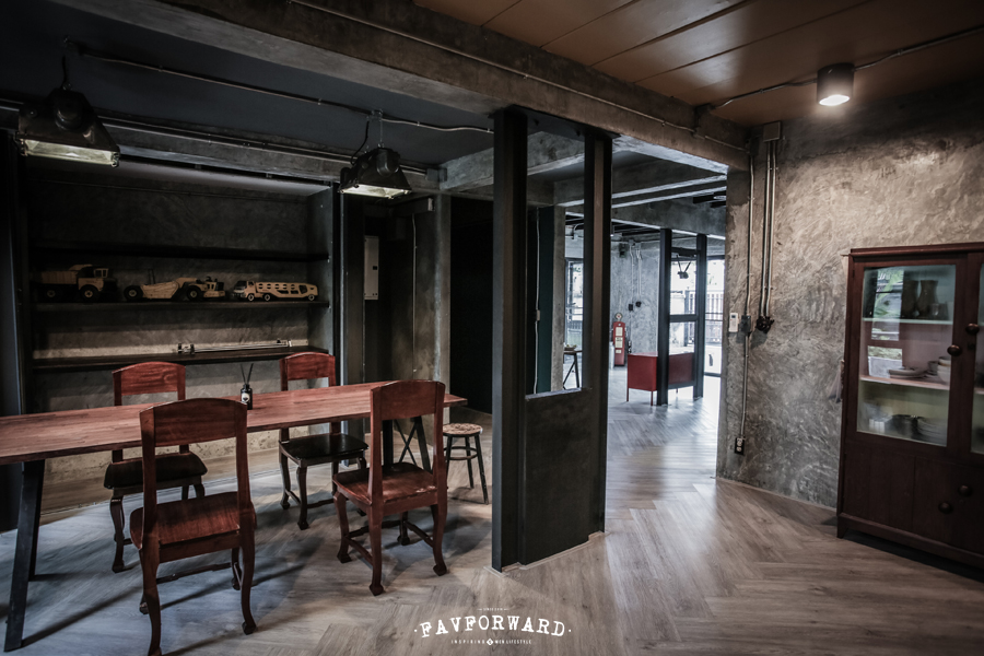 เมื่อเดินลึกเข้าไปก็จะพบกับโต๊ะรับประทานอาหารและห้องครัวที่มีพื้นที่กว้างไม่แพ้ส่วนหน้า ตัดความดิบให้บ้านน่าอยู่ด้วยเพดานสีเหลืองสดและผนังอิฐมอญสีส้ม โดยยังคงความเท่ด้วยโคมไฟเพดานที่เคยอยู่ในโรงซ่อมเครื่องบินกับตู้กับข้าวไม้วินเทจซึ่งเป็นเฟอร์นิเจอร์เก่าจากเจ้าของเดิม ส่วนห้องน้ำก็เก๋ไก๋ไม่แพ้กัน เริ่มจากการแต่งด้วยกระเบื้องลายสวยล้อมกรอบด้วยปูนเปลือย โดยชั้นล่างคุมโทนห้องน้ำด้วยสีเหลืองสดใส ส่วนชั้นสองเลือกคุมโทนด้วยสีฟ้าสบายตา ส่วนชั้นสองของบ้านเนรมิตเป็นห้องนอน 2 ห้องนอน 1 ห้องน้ำ และระเบียงนั่งเล่น โดยห้องนอนนั้นเน้นความเรียบง่าย โดยลดทอนความดิบของปูนเปลือยลงด้วยผนังสีฟ้า ส่วนระเบียงชั้นสองก็เนรมิตเป็นพื้นที่นั่งเล่นแบบเอ๊าต์ดอร์ที่ชวนคิดถึงบ้านเรือนไทย เพื่อให้สมาชิกได้มานั่งชิลยามว่าง