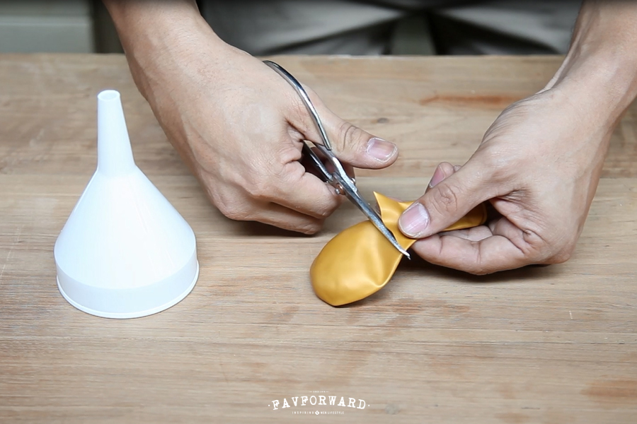 01.ตัดลูกโป่งออกเป็นสองส่วน โดยจะใช้เฉพาะส่วนปากลูกโป่งเท่านั้น