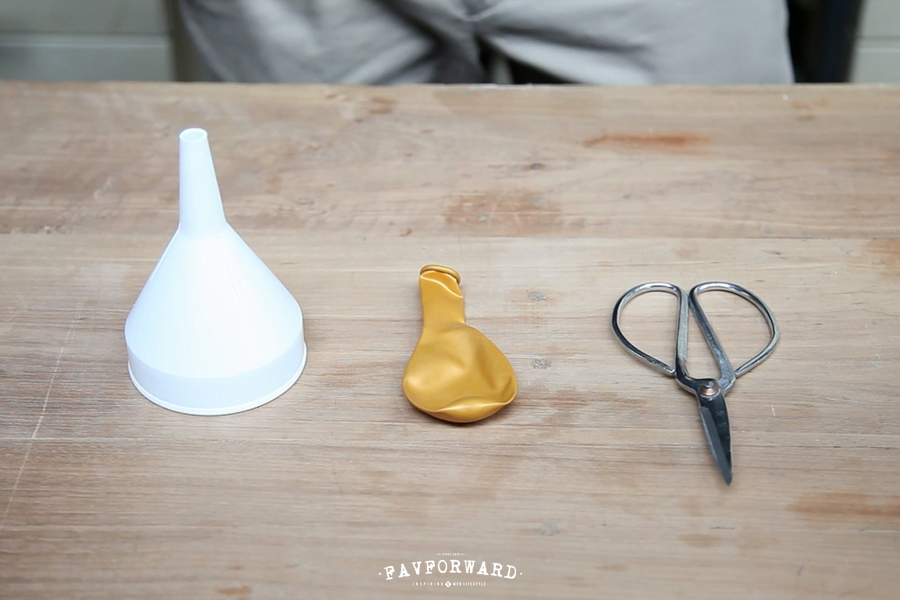 อุปกรณ์ : กรวยกรอกน้ำ กรรไกร และลูกโป่ง