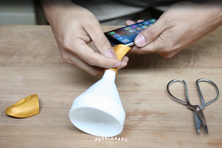 03.ดึงปลายลูกโป่งอีกข้างให้กว้าง เพื่อใส่สมาร์ทโฟน หลังจากนั้นก็เริ่มบรรเลงความสนุกด้วยเสียงเพลงกันเลย