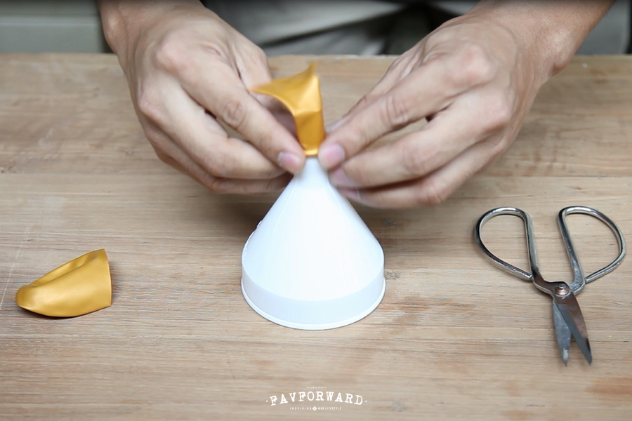 02.นำปากลูกโป่งไปใส่ไว้กับปลายกรวย