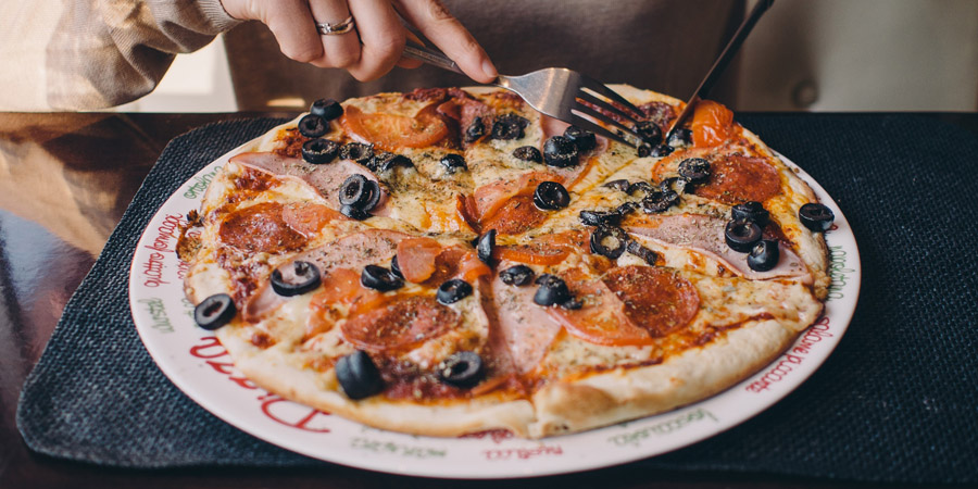 พิซซ่าแสนอร่อยอาจทำให้กินเพลินจนหมดทั้งถาดได้ พิซซ่าถาดใหญ่หนึ่งชิ้นให้พลังงานถึง 400 กิโลแคลอรี่ ดังนั้นเวลากินจึงไม่ควรกินแป้งพิซซ่า แต่ให้กินเฉพาะหน้าพิซซ่า และไม่ควรกินแตงกวาดองเพราะมีปริมาณน้ำตาลสูง นอกจากนี้ควรหยุดกินก่อนที่จะอิ่ม