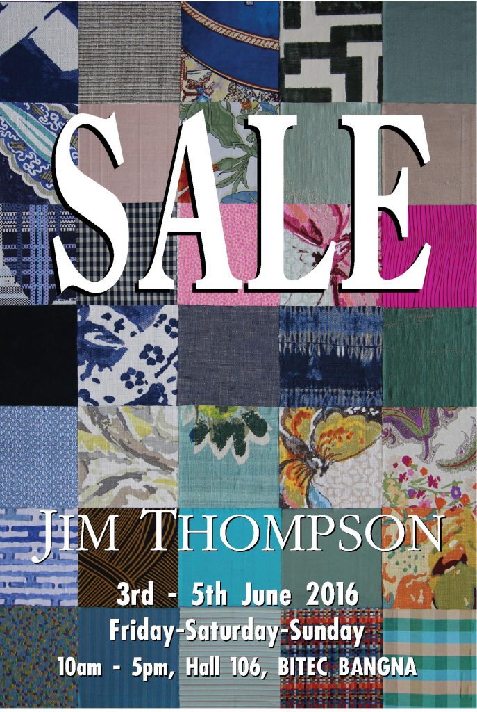 จิม ทอมป์สัน ชวนช้อปแบบจัดเต็มในงาน “จิม ทอมป์สัน เซลส์ 2016” (Jim Thompson Sale 2016) พบกับสินค้าหลากหลายรายการการันตีคุณภาพภายใต้แบรนด์ “จิม ทอมป์สัน” อาทิ เสื้อผ้าบุรุษ สตรี และเด็ก กระเป๋า รองเท้า แฟชั่นแอคเซสเซอรี่ ผ้าและสินค้าตกแต่งบ้าน ลดสูงสุดถึง 70% พร้อมส่งตรงความอร่อยสดใหม่ของผลผลิตทางการเกษตรปลอดสารพิษจาก “จิม ทอมป์สัน ฟาร์ม” ทั้งผัก ผลไม้ออร์แกนิก และสินค้าเกษตรแปรรูปยอดนิยม อาทิ ผลิตภัณฑ์จากใบและลูกหม่อน ผลิตภัณฑ์จากกล้วยหอม น้ำผึ้งดอกลำไย ฯลฯ พร้อมให้ทุกท่านได้ลิ้มลองและเลือกช้อปกันอย่างจุใจ