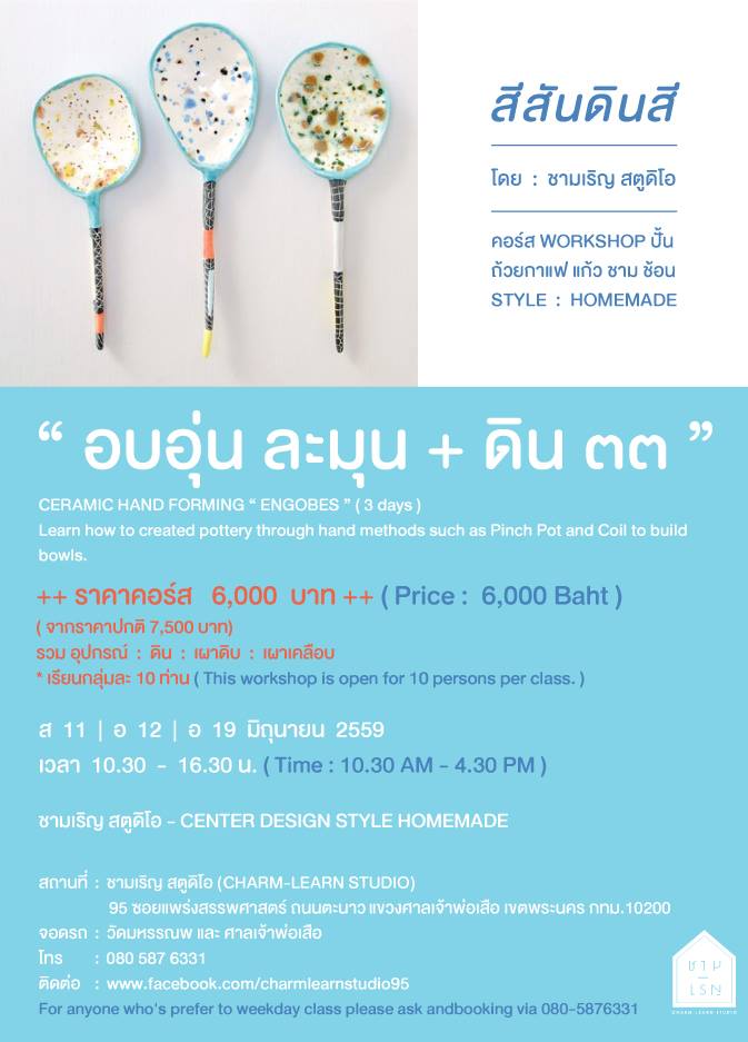 คอร์ส workshop ไปเรียนรู้การปั้นถ้วยกาแฟ แก้ว ชาม ช้อน ในสไตล์โฮมเมดสุดน่ารัก ออกแบบและสอนโดย ชามเริญ สตูดิโอ (CHARM-LEARN STUDIO) โดยเรียนกลุ่มละ 10 คน ราคารวมอุปกรณ์, ดิน, เผาดิบ และเผาเคลือบ 6,000 บาท/ท่าน