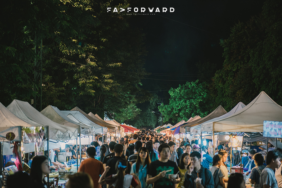 เมื่อตะวันเริ่มคล้อย เราก็มุ่งหน้าต่อกลับเข้าเมือง ไปถนนคนเดิน ไปหาของชิคๆ ในเมืองกินกัน แม้ตอนเย็นจะมีปอยฝนโปรยปรายมานิดหน่อย ทำให้ร้านค้าจำนวน 15% หายไป แต่ในส่วนปลายของถนนนั้น ก็ยังมีร้านค้าจำนวนไม่น้อยตั้งหน้าตั้งตาขายของกันต่อไป และเมื่อฝนจากไป ความคึกคักนั้นก็กลับมาอย่างรวดเร็ว เพลิดเพลินชิมไป ถ่ายไปกับขนมที่ได้กันมา 3-4 อย่าง