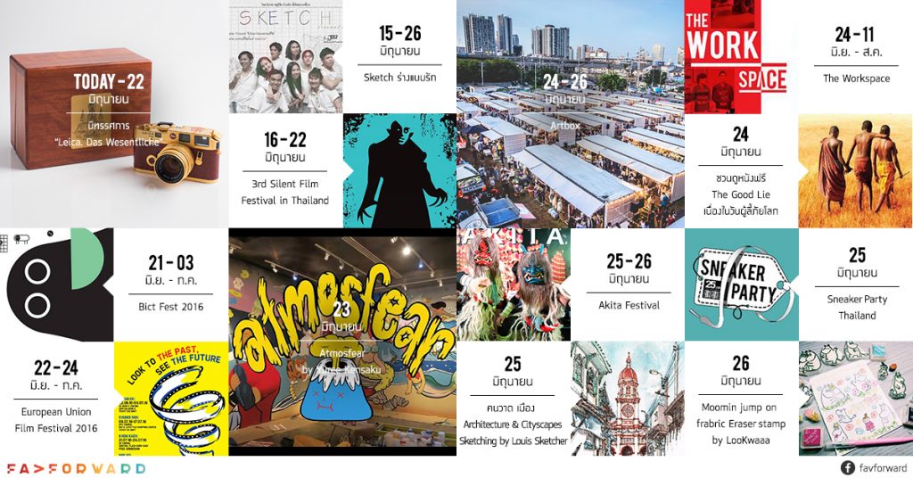ถ้าชีวิตมันเครียดนัก ต้องออกไปหาอะไรจรรโลงใจทำสักหน่อย บางทีการได้กดปุ่มหยุดพักเรื่องวุ่นวายในชีวิต แล้วหันไปเสพงานศิลป์ ฟังดนตรี หรือหาอะไรดีๆ ทาน ก็เป็นการเปลี่ยนบรรยากาศ เติมความสดชื่นให้ชีวิตขึ้นได้นะ และสัปดาห์นี้ Favforward ก็มี Event โดนๆ ประจำสัปดาห์มาฝากกันอีกครั้ง ทั้งงานนิทรรศการ ดนตรี เวิร์คช้อป และงานปาร์ตี้ของกลุ่มคอเดียวกัน ตั้งแต่วันที่ 20 – 26 มิถุนายน 2559 เพราะชีวิตไม่ได้มีอยู่เรื่องเดียว ฉะนั้นออกมาหาความสนุกให้กับตัวเองกันดีกว่า
