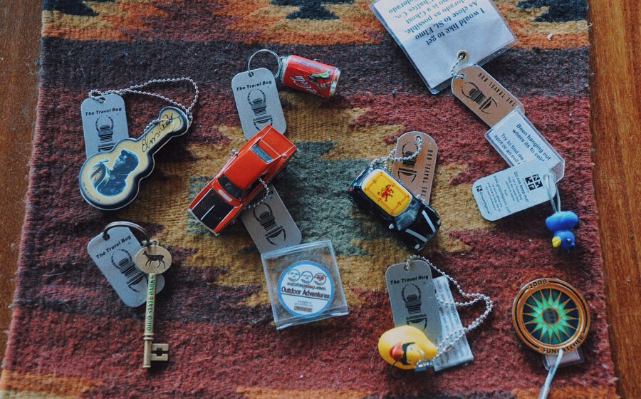 นอกจากค้นหาสมบัติแล้ว เจ้าGeocachingยังมีระบบ Travel Bugs ที่เปรียบเสมือนเหรียญบอกตำแหน่ง โดยในแต่ละเหรียญจะมีรหัสและเป้าหมายที่แตกต่างกันออกไปซึ่งตั้งโดยเจ้าของ เช่น Travel Bugs ชิ้นนี้ต้องการที่จะเดินทางไปรอบยุโรป จากนั้นก็นำไปวางในที่ซ่อนสมบัติ เมื่อผู้เล่นคนอื่นๆมาพบก็อาจจะเก็บหรือไม่เก็บเจ้าTravel Bugs กลับไปด้วยก็ได้ แต่ถ้ากลับไปด้วยก็นำรหัสที่ติดอยู่ไปล็อคอินในเว็บไซต์เพื่อดูจุดหมายปลายทางของมันและพยายามส่งต่อการเดินทางให้สำเร็จ