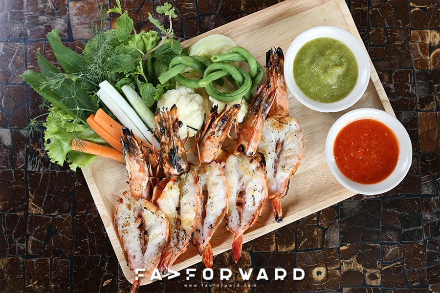 หลังจากติดใจกับเมนูกริลล์ของที่นี่ เลยต้องขอลองต่อกับมุมมองแบบไทยๆ กันบ้าง นั่นก็คือเมนูกุ้งเผา (Grilled Jumbo Prawns) ที่เป็น Selected ในกลุ่มอาหารไทยWindows of The World ความแตกต่างของกุ้งเผาที่นี่คือ ใช้กุ้งลายเสือของไทยคัดขนาด 15 ตัว/กิโลกรัม มาเผาร้อนๆ เสิร์ฟแบบผ่าหลังให้ทานได้ง่าย พร้อมน้ำจิ้มซีฟู้ดรสเด็ดครบรสทั้งเปรียว หวาน เผ็ด เค็ม ทานง่ายๆ ไม่เลอะมือ