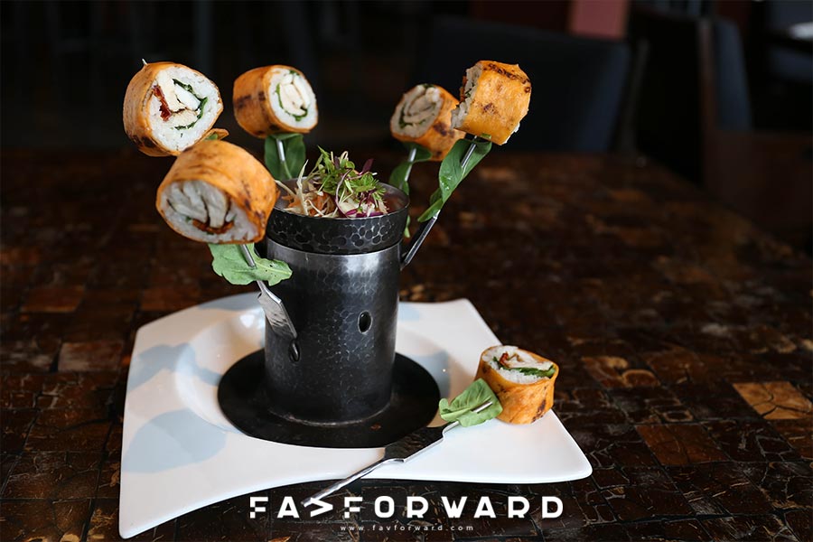 เริ่มต้นเบาๆ กับเมนูแรก Chicken Tortilla Roll บอกเลยว่าแค่เห็นภาพในเมนูแล้วอดใจไม่ไหวจริงๆ ที่จะลิ้มลอง เป็นเมนูทาปาสฟิวชั่น เลือกตีความใหม่ในการนำเสนอข้าวญี่ปุ่น ไก่ ห่อ จิ้มกับซอสอโวคาโดสูตรพิเศษ และเสียบมาให้ถือทานง่ายขึ้น ผสมผสานความเป็นญี่ปุ่นกับไทยเข้าไว้ด้วยกัน เรียกได้ว่ารูปลักษณ์ไม่ทิ้งความเป็นญี่ปุ่น แต่ก็ให้รสสัมผัสอร่อยแบบไทยๆ เป็นการเปิดเรียกน้ำย่อยได้ดี