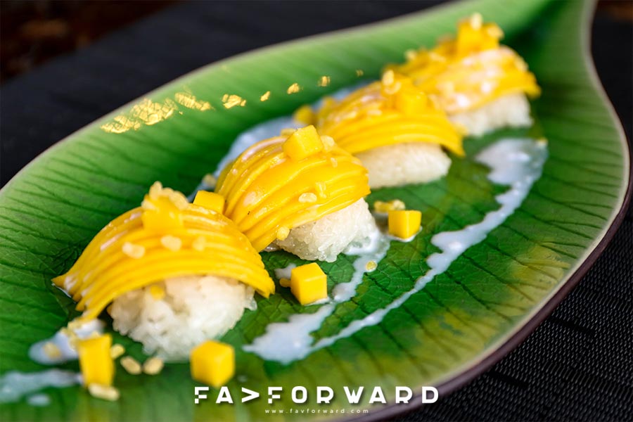 อิ่มกับออร์เดิร์ฟและมื้อหลัก ถึงเวลาชิมของหวานผ่อนคลายอารมณ์กันอีกสักนิด ที่ร้านแนะนำว่าเมนูข้าวเหนียวมะม่วงที่นี่นั่นไม่เหมือนใคร เสริ์ฟพอดีคำมองดูคล้ายกับซูชิปลาแซลมอน ราดด้วยน้ำกะทิเพิ่มรสเค็มนิดๆ ให้ความรู้สึกกลมกล่อม แต่ข้าวเหนียวมะม่วงจานเดียวก็ยังไม่พอกับแก๊งค์สาวๆ จัดกันต่อกับชีสเค้กบลูเบอรี่