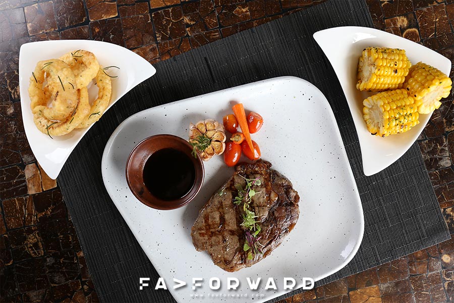 เมื่อถึงเวลาเมนูหลัก อดไม่ได้ที่จะต้องสั่งเมนูขึ้นชื่อของที่นี่ เสต็กเนื้อวากิว ส่วนริบอาย 300 กรัม (Grilled Wagyu Beef Rib Eye เลือกความสุกระดับ Medium กำลังพอดี บอกเลยว่าคนรักเนื้อวัวห้ามพลาดเมนูนี้ เนื้อวากิวส่วนริบอายที่ขึ้นชื่อเรื่องความนุ่ม เนื้อฉ่ำ และรสเข้ม ขนาด 300 กรัม เลือกซอสที่ชอบได้ 1 ชนิด จากรายการทั้งหมด 4 ชนิดได้แก่ ซอสเบอร์เนส ซอสเลมอนบัตเตอร์ ซอสไวน์แดง และซอสพริกไทย ทานคู่กับเครื่องเคียงที่สามารถเลือกได้ตามใจชอบอีก 2 ชนิด จาก 12 ชนิด ซึ่งเราเลือกทานกับข้าวโพดปิ้งและหัวหอมทอด