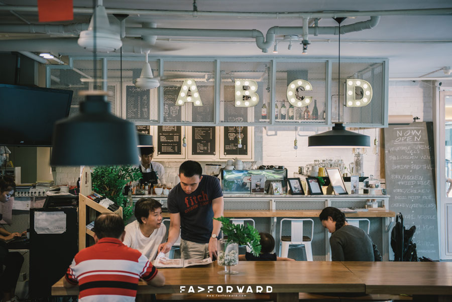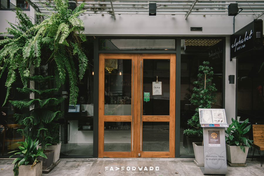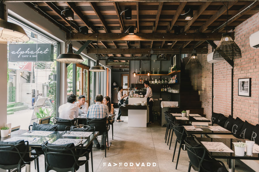 และจากการที่ Alphabet Cafe & Bar ต้องทำหน้าที่เป็นทั้งห้องอาหารให้บริการแก่แขกของโรงแรม และยังเป็นร้านอาหารกึ่งคาเฟ่ให้เราได้ไปนั่งทานอาหาร เสพย์บรรยากาศ และยังเป็นสถานที่รวมพลของก๊วนเพื่อน Alphabet Cafe & Bar จึงแบ่งพื้นที่เป็น 2 ส่วนด้วยกัน โดยมีห้องอาหารสำหรับเสิร์ฟอาหารเช้าให้แขกของโรงแรมกั้นกลาง ส่วนแรกนั้นเป็นพื้นที่สีขาวที่มีชื่อเล่นว่า ABCD ซึ่งเป็นพื้นที่ให้บริการแขกของโรงแรม สำหรับโซนนี้ตกแต่งอย่างเรียบง่ายแต่แฝงความเท่เอาไว้ด้วยการใช้สีขาวเป็นสีหลัก เพิ่มบรรยากาศชิลๆ ด้วยการออกแบบพื้นที่ให้โปร่ง โดยเฉพาะพื้นที่ด้านหน้าที่เนรมิตให้เป็นพื้นที่ outdoor รายล้อมด้วยต้นไม้สีเขียว ผสานความอบอุ่นด้วยเฟอร์นิเจอร์ไม้และแต่งแต้มความเท่ด้วยงานเหล็ก