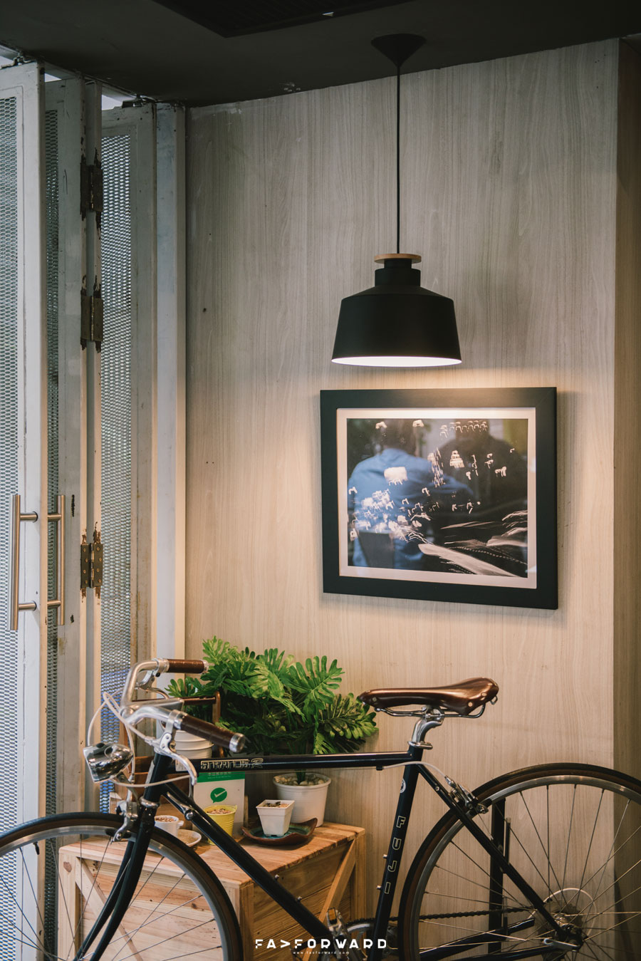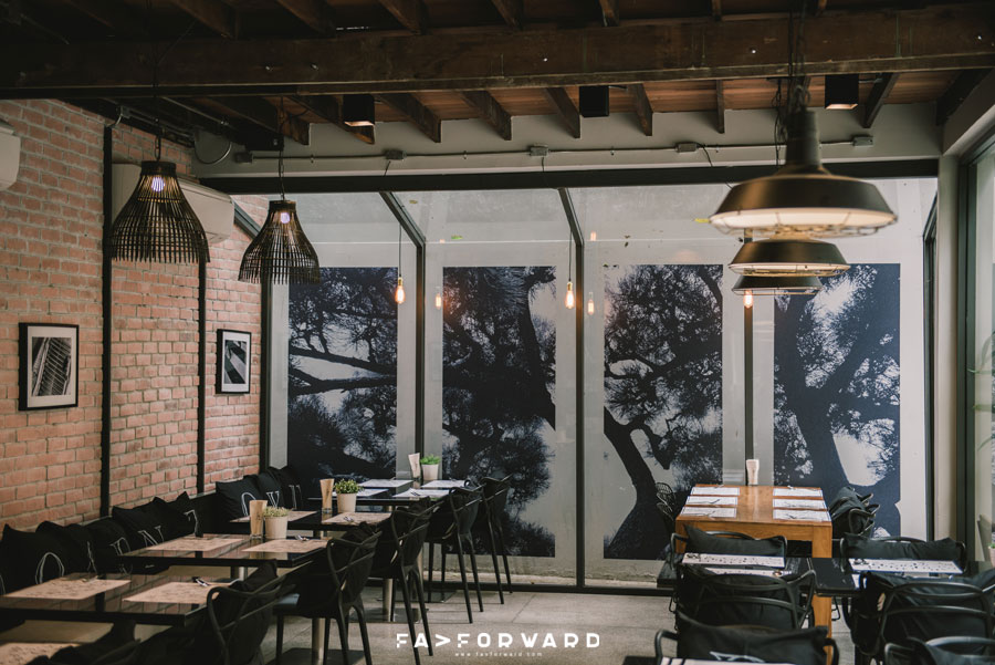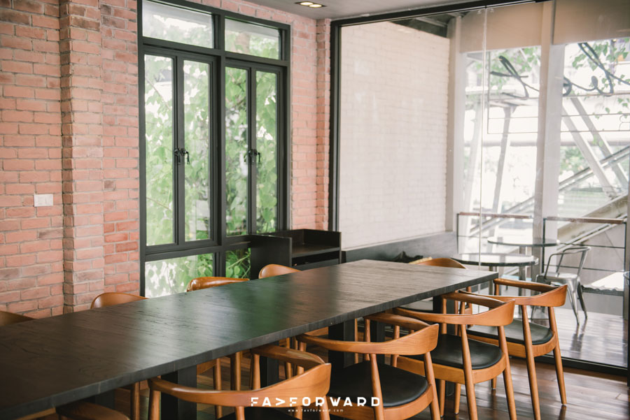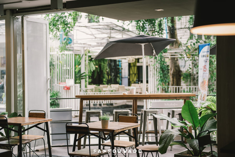 พื้นที่ส่วนที่สองเป็นโซนร้าอาหารและคาเฟ่ที่มีการออกแบบที่เรียกได้ว่าแตกต่างจากโซน ABCD เพราะในโซนร้านอาหารนี้ตกแต่งในสไตล์โมเดิร์นลอฟต์ที่มีทั้งความเนี้ยบและความเท่แบบดิบๆ ผสมผสานกันอย่างลงตัว ตั้งแต่ผนังร้านอิฐเปลือยกับเพดานไม้ที่แฝงเสน่ห์ตามแบบฉบับบ้านสองชั้นหลังเก่าเอาไว้ โดยชั้นสองของร้านทำหน้าที่เป็นทั้งพื้นที่ทานอาหารและยังเป็นห้องประชุมกึ่งห้องทำงานอีกด้วย ส่วนหน้าร้านโดดเด่นด้วยความร่มรื่นของต้นไม้หลากสายพันธุ์
