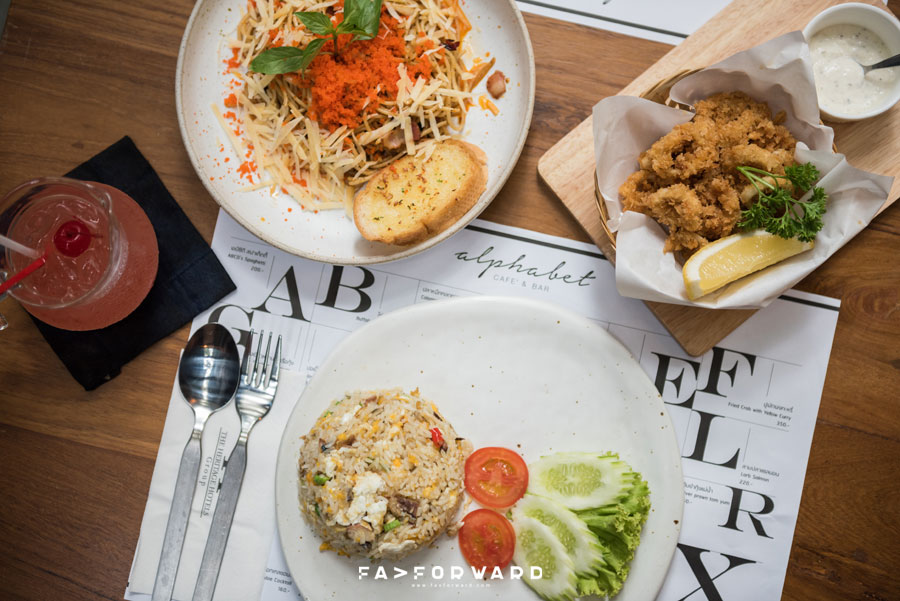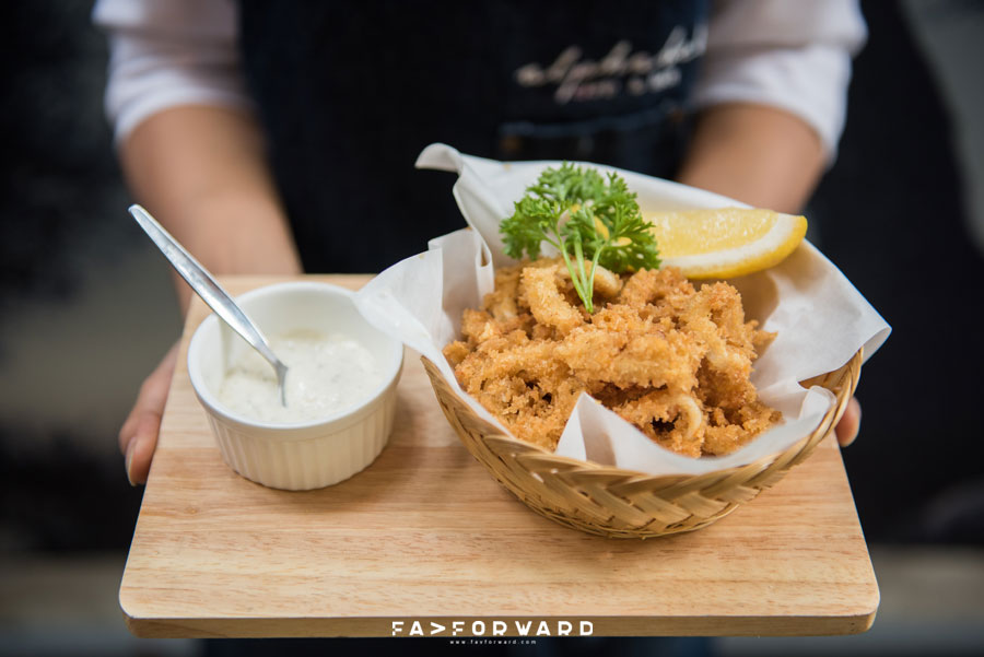 อีกหนึ่งเมนูยอดนิยมที่ใครมาเยือน Alphabet Cafe & Bar ต้องลิ้มลองกับเมนู Calamari (150 บาท) ปลาหมึกสดใหม่ที่นำมาชุปแป้งทอดในสไตล์อิตาลี เพิ่มความอร่อยด้วยรสเปรี้ยวเล็กๆ จากเลมอน ทานคู่กับซอสครีมสูตรของร้าน เป็นเมนูทานเล่นที่เราไม่ควรพลาด