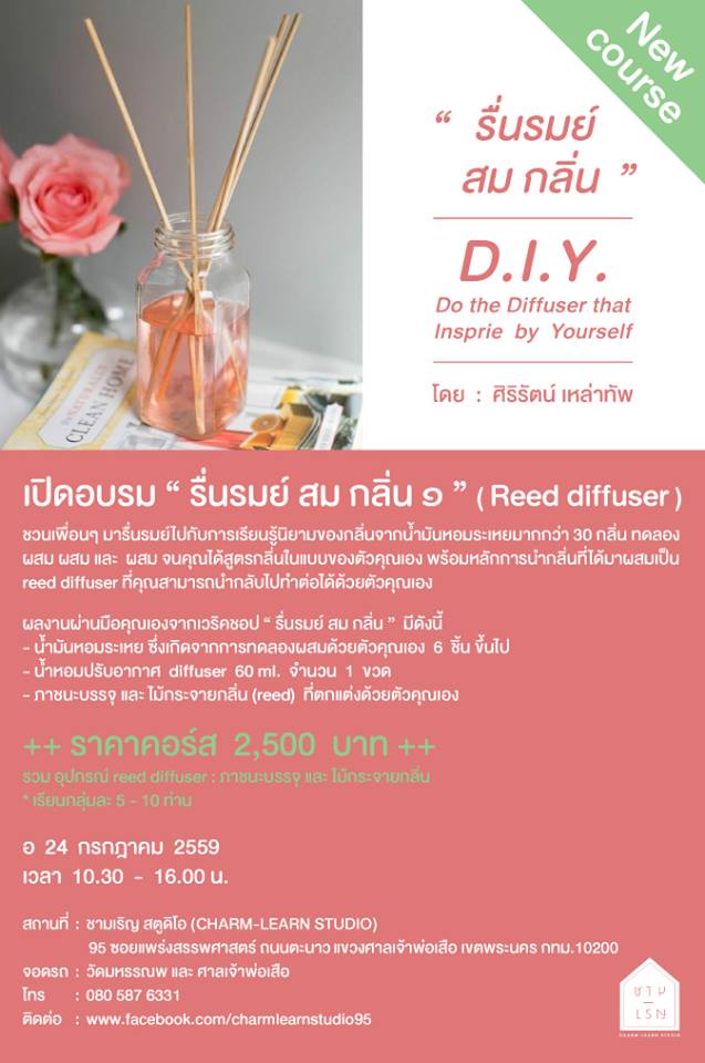 ชวนเพื่อนๆ มารื่นรมย์ไปกับการเรียนรู้นิยามของกลิ่นจากน้ำมันหอมระเหยมากกว่า 30 กลิ่น ทดลอง ผสม ผสม และ ผสม จนคุณได้สูตรกลิ่นในแบบของตัวคุณเอง พร้อมหลักการนำกลิ่นที่ได้มาผสมเป็น reed diffuser ที่คุณสามารถนำกลับไปทำต่อได้ด้วยตัวคุณเอง สอนโดยคุณศิริรัตน์ เหล่าทัพ จำนวนจำกัดเพียง กลุ่มละ 5 – 10 ท่าน ราคาคอร์ส 2,500 บาท/ท่าน (รวมอุปกรณ์ reed diffuser ภาชนะบรรจุ และ ไม้กระจายกลิ่น)