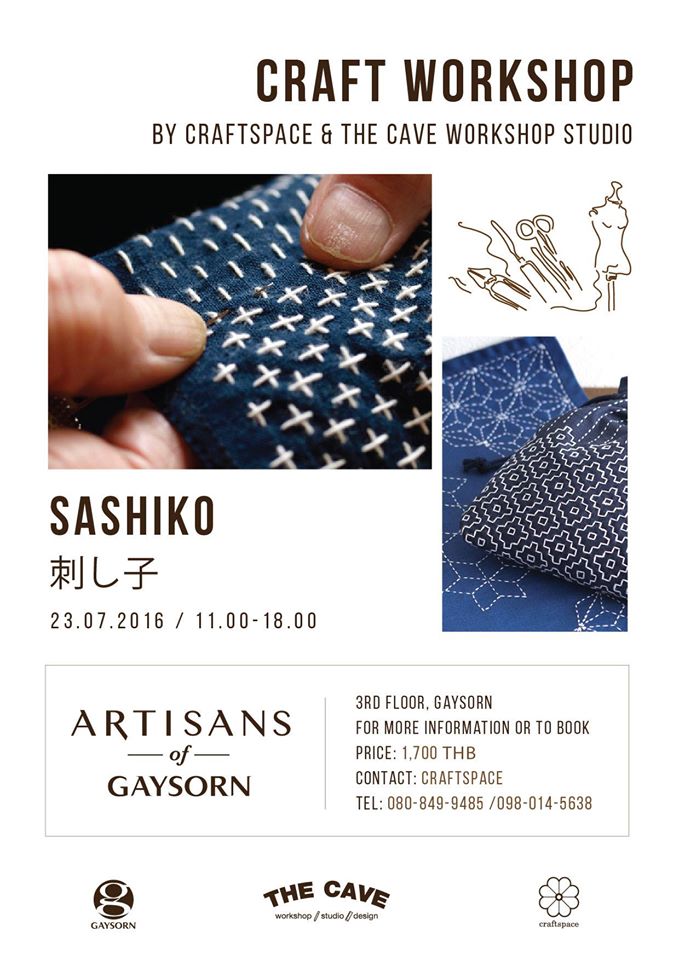 ใครที่ชื่นชอบงานเย็บปักถักร้อยต้องไม่พลาดกับเวิร์คช็อป “ปักผ้าสไตล์ญี่ปุ่นโบราณ” ด้วยเทคนิค Sashiko บนผ้าคราม (Indigo) ซึ่งจะใช้ด้ายสีขาวปักเนาหรือด้นเป็นลวดลายต่างๆ ไปบนผ้าทอย้อมคราม รวมถึงการเรียนเพื่อสร้างสรรค์ลวดลายใหม่ๆ ที่จะทำให้งานปัก “ซาชิโกะ” เป็นเรื่องน่าสนุกและใช้ประโยชน์ได้มากขึ้น งานนี้รับเพียง 15 ท่าน ราคาท่านละ 1,700 บาท