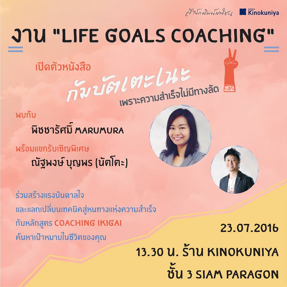 ใครที่เป็นแฟนคลับของ marumura ต้องไม่พลาดกับงาน “Life Goals Coaching” งานเปิดตัวหนังสือ “กัมบัตเตะเนะ! เพราะความสำเร็จไม่มีทางลัด” ที่จะมาสร้างแรงบันดาลใจและแลกเปลี่ยนเทคนิคสู่หนทางแห่งความสำเร็จกับหลักสูตร COACHING IKIGAI ค้นหาเป้าหมายในชีวิตของคุณ พร้อมพูดคุยกับคุณวิรุณรัช พจน์เสถียรกุล (พิชชารัศมิ์ Marumura) และแขกรับเชิญ คุณนัตโตะ – ณัฐพงษ์ บุญพร (เจ้าของบริษัท JTbiz และร้านอาหาร ล่ามอาชีพและนักเขียนหนังสือภาษาญี่ปุ่นชื่อดัง) และยังได้ Coaching ในหัวข้อ “อิคิไก (ikigai) เหตุผลของการมีชีวิตอยู่ของคุณคืออะไร” อีกด้วย