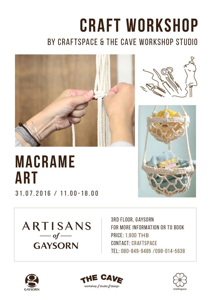 สาวๆ ผู้รักการแต่งบ้านต้องไม่พลาดกับเวิร์คช็อป Macrame Art หรือศิลปะการถักเชือก เมคราเม่ ซึ่ง เป็นศิลปะที่เกิดจากการถักเชือก หรือผูกเงื่อน ซึ่งสามารถนำมาประยุกต์ทำงานประดิษฐ์ได้หลากหลาย โดยเวิร์คช็อปคอร์สนี้จะนำคุณไปเรียนวิธีการถักเชือกและการสร้างลวดลายประยุกต์ของการถักเชือกให้เรียบเท่และโมเดิร์น เพื่อสร้างบรรยากาศให้มุมโปรดของบ้านด้วยงานถักเชือกสไตล์มาคราเม่ด้วยฝีมือคุณเอง รับจำนวนจำกัดเพียง 15 ท่าน ท่านละ 1,900 บาท