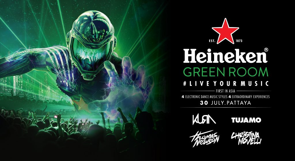 Heineken® Green Room (ไฮเนเก้น กรีน รูม) อีกหนึ่งประสบการณ์ทางดนตรีแห่งปีที่ทุกคนจะจดจำ ด้วยดนตรีสุดมันส์จาก 4 ดีเจระดับโลก กับ 4 แนวทางดนตรีอิเล็กทรอนิกส์ที่แตกต่าง พร้อม Kandi Konnection ที่เปิดโอกาสให้ทุกคนได้สัมผัสวัฒนธรรมทางดนตรีร่วมกัน และเติมเต็มประสบการณ์การดื่มที่มากยิ่งขึ้นด้วย Club Bottle ขวดเรืองแสงจากไฮเนเก้นที่มีเฉพาะงานนี้เท่านั้น