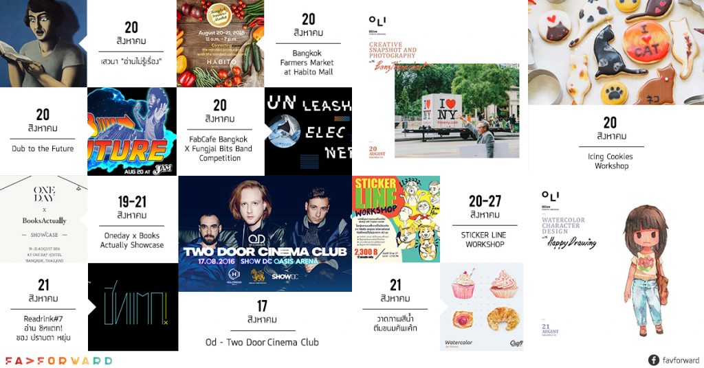 กิจกรรมดีๆ บางทีก็ไม่ต้องใช้เงินมาก แต่แลกมาซึ่งคุณค่าทางจิตใจ ใครอยากออกไปทำกิจกรรมกับ Event ดีๆ วันนี้ FAVFORWARD นำมาฝากกันอีกแล้ว ทั้งฟรีและเสียค่าใช้จ่าย แต่ถ้ายอมเสียเงินแล้วได้ความรู้สึกสุขใจกลับมา ก็น่าลงทุนใช่มั้ยล่ะ ไม่ว่าจะเป็นนิทรรศการงานศิลป์ คอนเสิร์ต Workshop มาร์เก็ต หรือสัมนาน่าสนใจประจำสัปดาห์ ตั้งแต่วันที่ 15 – 21 สิงหาคม 2559 ลงคิวหาเวลาว่างแล้วออกไปเติมเต็มความสนุกให้กับชีวิตกัน