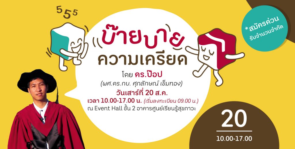 Event: “บ๊ายบายความเครียด” SOOK by สสส. โดย ดร.ป๊อป (ผศ.ดร.กบ. ศุภลักษณ์ เข็มทอง)