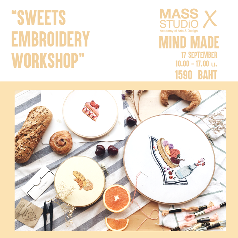 ใครที่ชื่นชอบงานปักต้องไม่พลาดกับคลาส Sweets Embroidery Workshop ซึ่ง MASS STUDIO ร่วมกับ Mind made สำหรับคลาส Sweets Embroidery Workshop เป็นการเรียนรู้เทคนิคการปักผ้าด้วยมือ (Embroidery) โดยเริ่มต้นตั้งแต่ลายพื้นฐานจนนำมาสร้างสรรค์ผลงานในรูปแบบของขนมเค้กน่ารักๆ ซึ่งมีเจ้าของเพจ Mind made เป็นครูผู้สอนในครั้งนี้ คลาสนี้รับจำนวนจำกัดเพียง 12 ท่านเท่านั้น ค่าเรียนท่านละ 1,590 บาท (รวมค่าอุปกรณ์และอาหารว่าง)