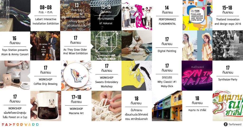 ฝนก็ตกทุกเย็นไม่บอกไม่กล่าว แถมเดินทางมาถึงเกือบกลางเดือน เงินในกระเป๋าก็เริ่มแห้งเหี่ยว ถ้าไม่รีบทำงานเสร็จกลับบ้าน ก็ยังมีอะไรดีๆ ที่จะฟื้นฟูจิตใจคุณได้ในแบบประหยัดไม่ต้องใช้สตางค์มาก กับ EVENT ที่ FAVFORWARD ชวนออกไปทำประจำวันที่ 12 – 18 กันยายน 2559 …..รออะไรเก็บของด่วน!