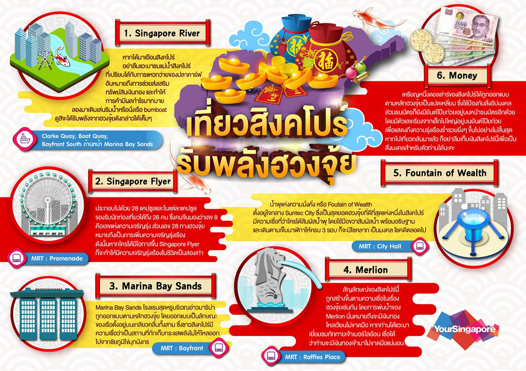 - Singapore River หรือ แม่น้ำสิงคโปร์นั้น ได้รับการจัดวางให้มีลักษณะคล้ายปลาคาร์ฟที่แหวกว่ายอยู่ในย่านธุรกิจที่สำคัญ โดยหลักความเชื่อทางฮวงจุ้ยเชื่อกันว่าปลาคาร์ฟ หรือ “หลี่ฮื้อ” เป็นสัญลักษณ์มงคลแห่งความอุดมสมบูรณ์และความสำเร็จ เมื่อภูมิศาสตร์แม่น้ำมีรูปร่างเหมือนปลาคาร์ฟแหวกว่ายในสายน้ำ จึงสื่อถึงความมั่งคั่งทางธุรกิจนั่นเอง ใครอยากรับพลัง ลองเปลี่ยนบรรยากาศมาล่องเรือ Bumboat ดูสิ นอกจากจะได้สัมผัสทัศนียภาพสองฝั่งแม่น้ำสิงคโปร์ ยังสามารถเปิดรับพลังจากปลาคาร์ฟได้เต็มๆ อีกด้วย