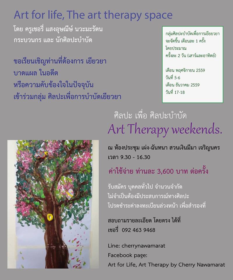 Art for life ของครูเชอรี่มีวัตถุประสงค์ที่จะจัดกระบวนการศิลปะบำบัดแบบกลุ่ม หรือเดี่ยว แก่บุคคลทั่วไป ที่มีความสนใจอยากให้กระบวนการ ศิลปะ หรือ Art Therapy นำพาไปคลี่คลายสิ่งที่รบกวนความรู้สึก และทำให้เกิดความเศร้าหมอง คับข้องใจ และดำเนินการจัดกลุ่มศิลปะบำบัดมาแล้วหนึ่งครั้ง ในเดือนสิงหาคมที่ผ่านมา