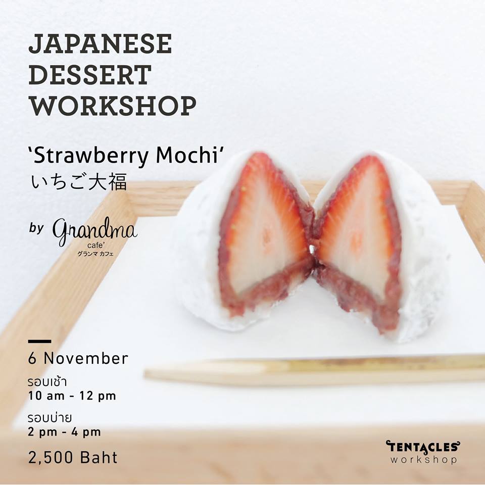 เวิร์คช็อปครั้งนี้ คุณนิจาก Grandma cafe ผู้ร่ำเรียนฝึกขนมตำหรับโตเกียวที่ Sohonke Yoshihiro โรงเรียนทำขนมชื่อดังในเมืองโตเกียวที่ก่อตั้งในยุคโชวะ จะมาชวนทำอิจิโกะไดฟุกุ และไม่ว่าคุณจะเป็นผู้ชายหรือคุณผู้หญิง ไม่จำเป็นต้องมีพื้นฐานหรือประสบการณ์ใดๆ ก็เรียนได้ ค่าเรียนท่านละ 2,500 บาท (รวมอุปกรณ์แล้ว)