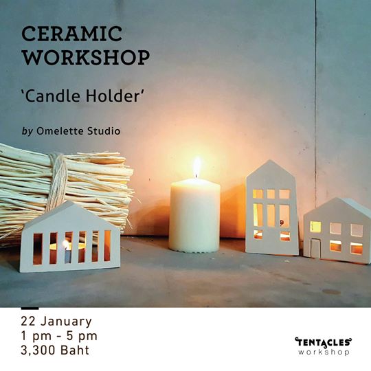 อีกหนึ่งเวิร์คช็อปที่มาเอาใจคนรักการปั้นและเพ้นท์เซรามิกกับคลาส “Ceramic candle holder” ที่ให้คนรักงานปั้นได้รังสรรค์ผลงานเช็ตใหญ่ห่อกลับบ้าน เพิ่มความไม่ธรรมดากันด้วยไอเดียปั้น “บ้านเทียนหรือกระโจม” แทนการปั้นจาน ชาม และถ้วย ซึ่งคลาสนี้เป็นการเพิ่มทักษะการปั้นเซรามิกกับ Omelette studio สตูดิโอเซรามิคน้องใหม่นั่นเอง ค่าเรียน 3,300 บาท รวมอุปกรณ์และเผาให้แล้ว โดยจะได้รับผลงานที่เผาแล้วอีก 1 อาทิตย์ ผู้เรียนไม่มีพื้นฐานก็สามารถเรียนได้
