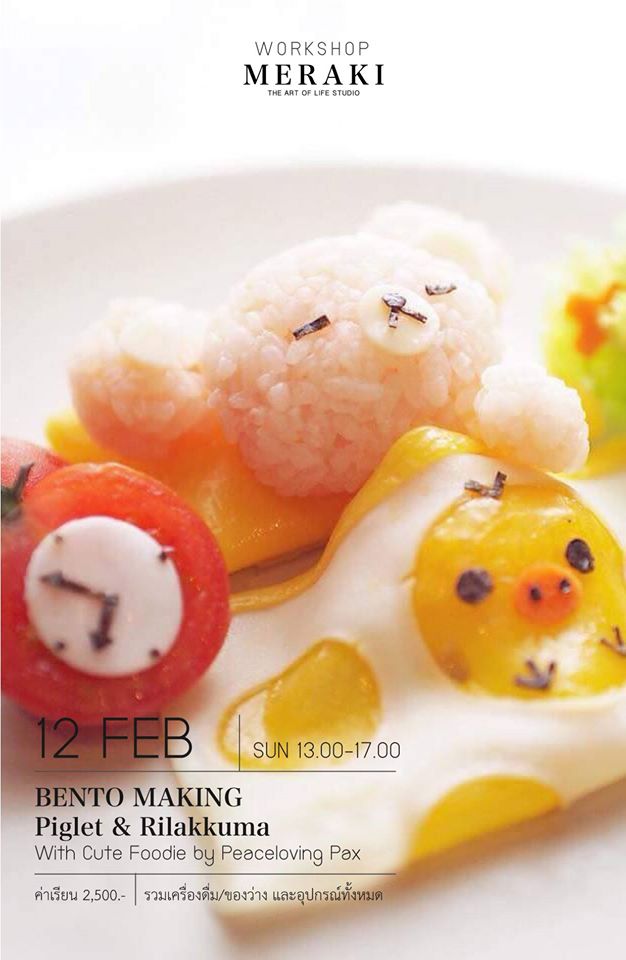 Charaben ถูกจัดทำขึ้นด้วยความหวังอย่างหนึ่งคือเพื่อให้เด็กน้อยที่ไม่ชอบกินผักหรืออาหารบางชนิด เห็นข้าวกล่องที่มีการ์ตูนตัวโปรดแล้วจะทานอาหารได้มากขึ้น จนถึงลืมรสชาติของผักที่ไม่ชอบไปเลยก็เป็นได้ เราจึงชวนให้คุณมาฝึกทำข้าวกล่องแสนน่ารักด้วยความรัก ความใส่ใจสุขภาพของคนกิน ใช้วัตถุอย่างดี สะอาดถูกอนามัย ปรุงแต่งให้น้อย แต่ได้รสชาติจากธรรมชาติที่แท้จริงของวัตถุดิบนั้นๆ ด้วยกัน รับรองว่าการ์ตูนตัวโปรดบวกความใส่ใจ จะทำให้ผู้รับ bento นี้ยิ้มไม่หุบแน่นอนกับคลาส BENTO-MAKING WORKSHOP ที่มีในธีม rilakkuma & piglet โดย หมอแป๊ก-นวพร ผิวผัน Cute Foodies by Peaceloving Pax ค่าเรียน 2,500 บาท (รวมอุปกรณ์, อาหารว่าง/เครื่องดื่ม)