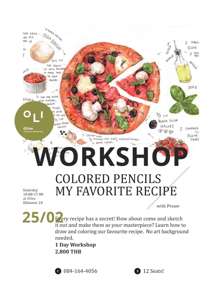 มาทำให้ท้องหิวด้วยคลาส “เมนูอาหารสุดเย้ายวนใจ” (Colour Pencils My Favorite Recipe) ซึ่งเปิดเป็นครั้งที่ 2 แล้วสำหรับ Olive Creative Laboratory โดยคลาสนี้คุณจะได้เรียนรู้การวาดเมนูอาหารด้วยเทคนิคสีไม้ ทั้งการวาดอาหารจานหลัก เครื่องเคียง ส่วนผสม ผักหญ้า เครื่องปรุงใบเล็กที่น่ารักสุดลงตัว พร้อมเขียนเมนูอหารและส่วนประกอบยุกยิกสุดน่ารัก เคล็ดลับก็คือไม่จำเป็นต้องวาดเหมือนแบบแต่ก็ให้ความรู้สึกที่เหมือนได้ การใช้สี-แสงเงาให้ได้อย่างเหมาะสม เพื่อผลลัพท์อาหารที่ดูน่ากินกว่าความเป็นจริง ผลงานที่สำเร็จสามารถนำไปประกอบเป็นเมนูอาหารหรือ ใส่กรอบมอบเป็นที่ระลึกก็ยิ้มหวานสุดเย้ายวนใจ