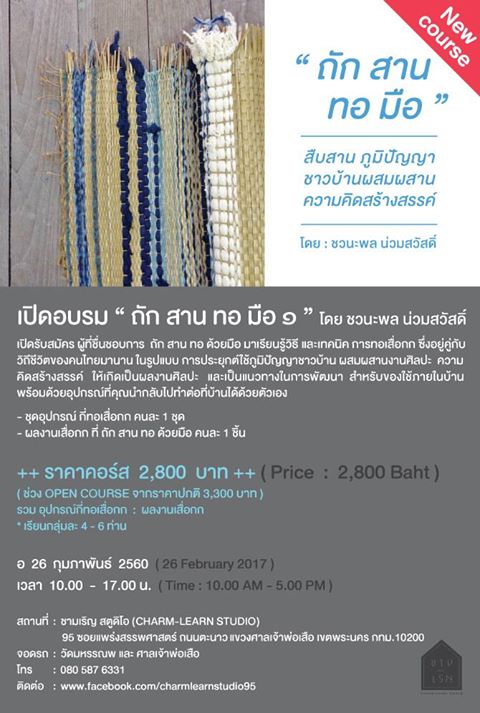 ใครชอบงานถัก สาน ทอด้วยมือ ต้องมาเรียนรู้และเทคนิคการทอสื่อกก ซึ่งเป็นงานหัตถกรรมคู่วิ๔ชีวิตคนไทยมานาน ในรูปแบบการประยุกต์ใช้ภูมิปัญญาชาวบ้าน ผสมผสานงานศิลปะ ความคิดสร้างสรรค์ให้เกิดเป็นผลงานศิลปะและเป็นแนวทางในการพัฒนาสำหรับของใช้ภายในบ้าน โดยคลาสนี้มีอุปกรณ์ให้คุณนำกลับไปทำต่อที่บ้านได้ด้วยตัวเอง สอนโดย ชวนะพล น่วมสวัสดิ์ ค่าเรียน 2,800 บาท/คน
