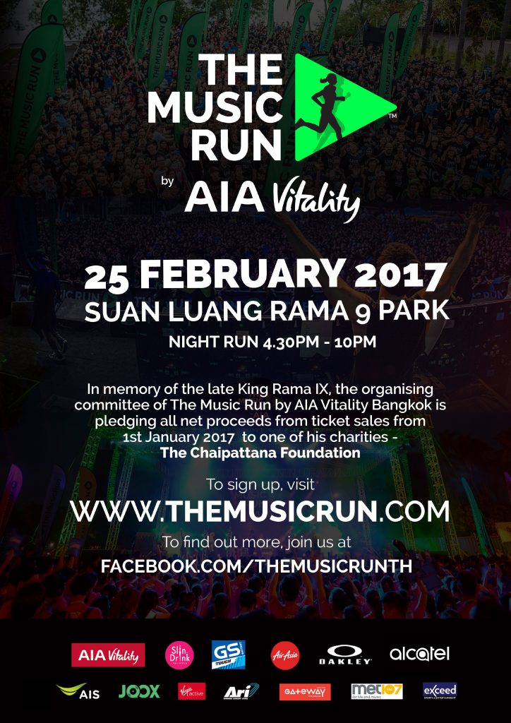 กลับมาอีกครั้งกับมหกรรมวิ่งสุดมันส์ “เดอะมิวสิค รัน บาย เอไอเอ ไวทัลลิตี้” ครั้งที่ 3 (The Music Run™ by AIA Vitality) บนเส้นทางแห่งเสียงดนตรีสไตล์อินเตอร์แอคทีฟ ในรูปแบบ “ไนท์ รัน” ที่จะได้ทั้งวิ่ง-เต้น- เล่น-ร้อง บนระยะทาง 5 กิโลเมตร 5 โซนดนตรี ได้แก่ ร็อค ป๊อป โอลด์สคูล ฮิปฮอป และแดนซ์ ท่ามกลางบรรยากาศแสงสีเสียงแบบจัดเต็ม พร้อมคอนเสิร์ตสุดมันส์จากศิลปินแนวหน้าของประเทศไทยอย่าง “Getsunova” และอาฟเตอร์ปาร์ตี้กับดีเจหนุ่มสุดฮ็อตจากออสเตรเลีย “แซม วิทเทอร์ส” พร้อมกระทบไหล่เหล่าซุปตาร์ อาทิ นาวิน ต้าร์ และ เต้ย จรินทร์พร