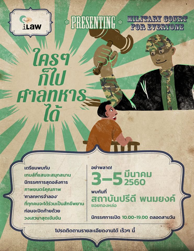 16.30 – 17.30 น. พบกับ “ศาลทหารจำลอง” ที่คุณจะได้ชมกระบวนการพิจารณาคดีในศาลซึ่งถอดมาจากประสบการณ์จริงของผู้สังเกตการณ์คดี ทนาย และจำเลย