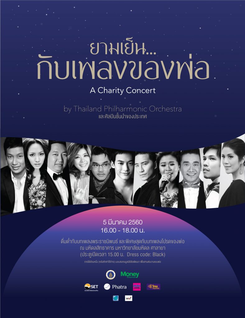 คอนเสิร์ตการกุศลเวทีแรก! ดื่มด่ำไปกับบทเพลงของพ่อ 3 รูปแบบบนเวทีเดียว กับ 1) เพลงพระราชนิพนธ์ ที่นับเป็น “เพลงของพ่อ” 2) เพลงโปรดของพ่อ และ 3) เพลงเพื่อพ่อ ถ่ายทอดโดยโดยศิลปินระดับแนวหน้า อาทิ บี้ – สุกฤษฏิ์ วิเศษแก้ว, น้ำชา – ชีรณัฐ ยูสานนท์, หนูนา – หนึ่งธิดา โสภณ, เนม – ปราการ ไรวา, บี้ – ธรรศภาคย์ ชี, น้ำมนต์ – ธีรนัยน์ ณ หนองคาย, พินต้า – ณัฐนิช รัตตนเสรีเกียรติ, กานต์ จั่นทอง, สมา สวยสด, ดลชัย บุณยะรัตเวช ฯลฯ ร่วมกับ วงดุริยางค์ฟีลฮาร์โมนิแห่งประเทศไทย (Thailand Philharmonic Orchestra – TPO)