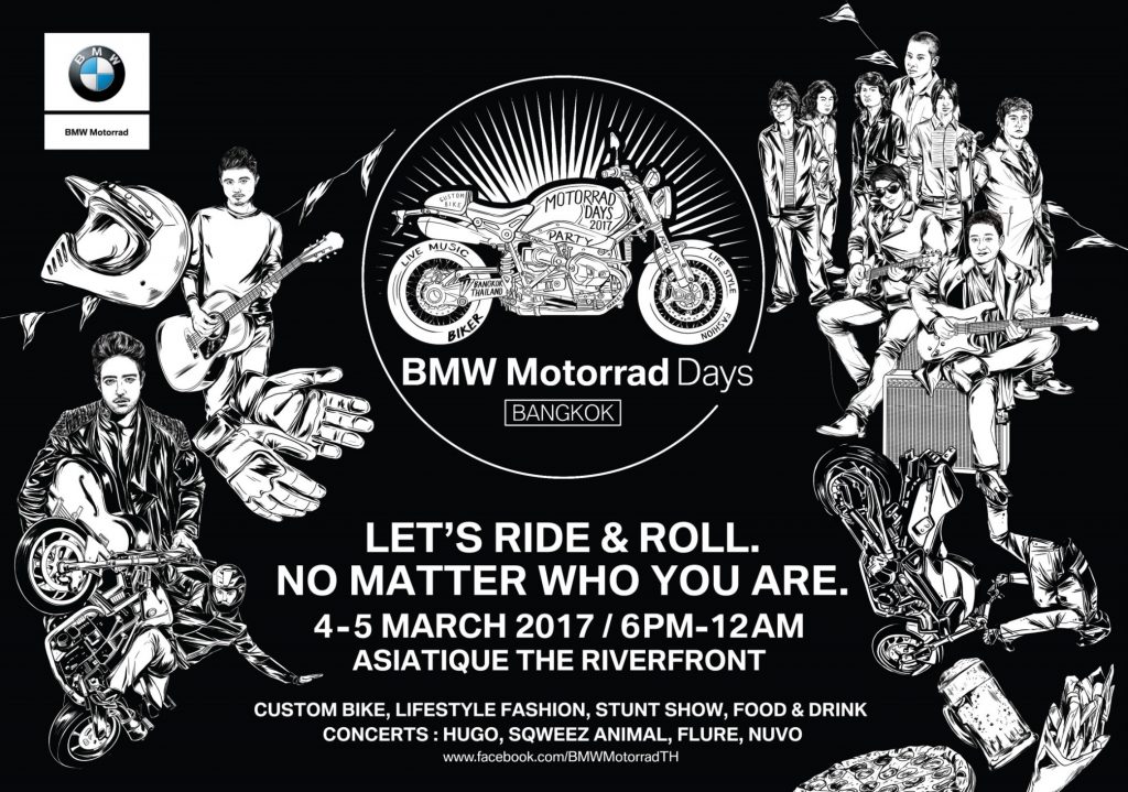 งานเทศกาลของคนรักบิ๊กไบค์แห่งปี พร้อมเชิญชวนแฟนรถมอเตอร์ไซค์บิ๊กไบค์ไม่จำกัดค่ายร่วมสังสรรค์และสัมผัสประสบการณ์สุดพิเศษ ภายในงาน พบกับการเปิดตัวของรถมอเตอร์ไซค์รุ่นใหม่ครั้งแรกในประเทศไทย พร้อมตื่นตาตื่นใจกับกิจกรรมสุดเอ็กซ์คลูซีฟมากมาย ไม่ว่าจะเป็น สตั้นท์ โชว์ ครั้งแรกในไทยจาก BigJim นักขี่มอเตอร์ไซค์ผาดโผนชาวฝรั่งเศสที่มีชื่อเสียงระดับโลก คอนเสิร์ตสุดมันส์จากศิลปินชั้นนำที่ยกขบวนมาสร้างสีสัน ได้แก่ วงนูโว วงฟลัวร์ ฮิวโก้-จุลจักร จักรพงษ์ และวิน สควีซแอนนิมอล เพลิดเพลินกับร้านค้าและกิจกรรมอีกมากมาย ไม่ว่าจะเป็นอุปกรณ์ตกแต่ง เสื้อผ้าเครื่องแต่งกาย การบริการตรวจเช็ครถมอเตอร์ไซค์บีเอ็มดับเบิลยูเบื้องต้น และพิเศษกับคอลเลคชั่นของสะสม BMW Motorrad Days จำหน่ายเฉพาะในงานนี้เท่านั้น