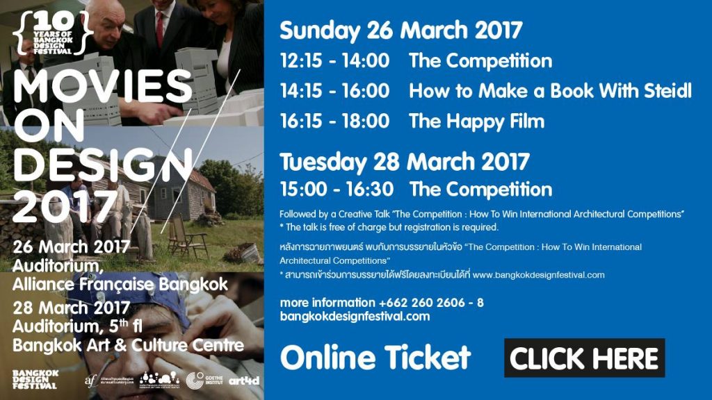 ภาพยนตร์สารคดี 3 เรื่อง จาก 3 วงการออกแบบ ที่จะมาสร้างแรงบันดาลใจอย่างต่อเนื่องตลอดบ่ายวันที่ 26 มีนาคม 2560 ที่สมาคมฝรั่งเศสกรุงเทพ