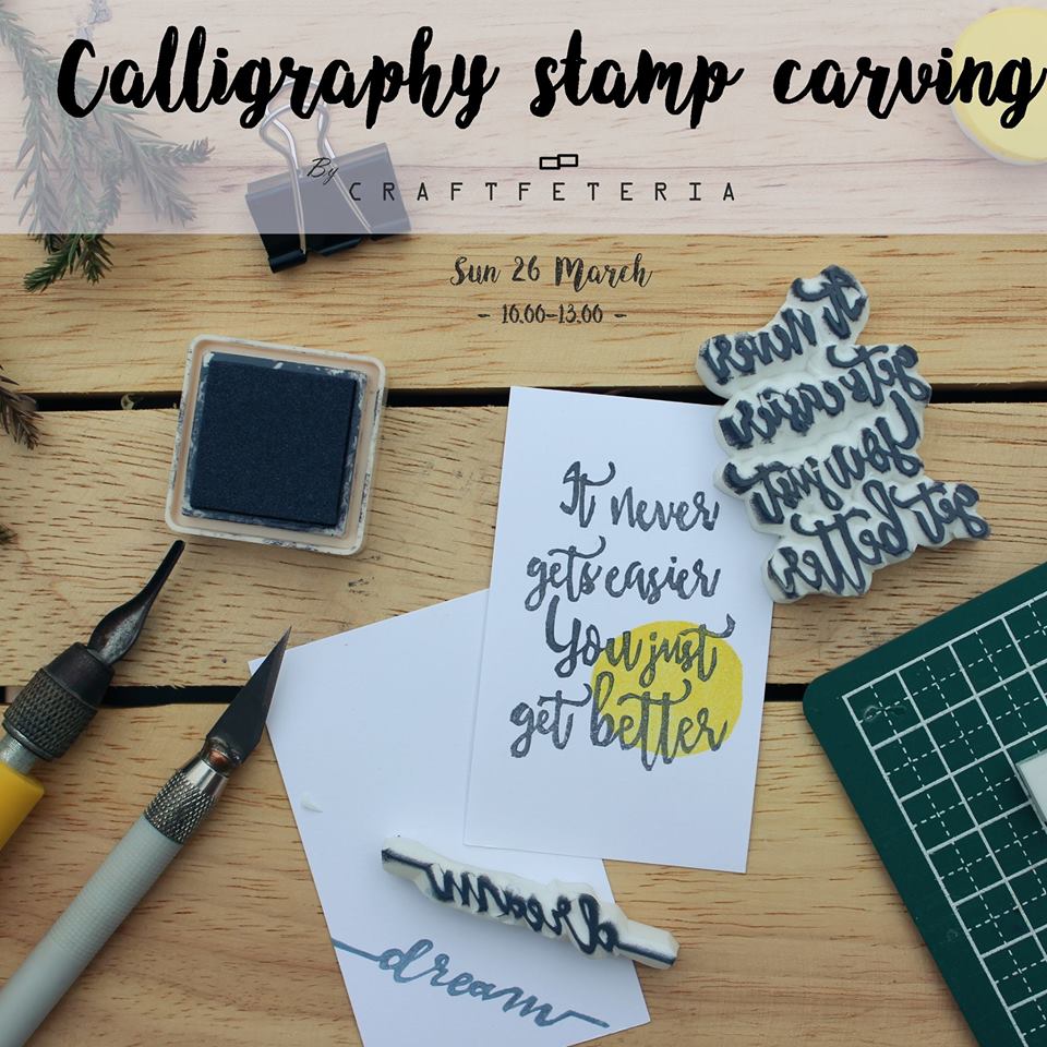 คลาส “เซาะคำทำตรายาง” (Calligraphy stamp carving) เป็นกิจกรรมที่เหมาะแก่มวลมนุษยชาติที่ลุ่มหลงการขุดแคะแกะเกลา เนื่องจากพวกเราจะพาท่านจับมีดหนึ่งเล่ม เล็มเลาะเซาะยางลบชั้นดีเนื้อนุ่ม จนกลายเป็นตัวปั๊มกลุ่มคำภาษาอังกฤษ ที่มีความวิจิตรบนเส้นสาย (Calligraphy) เตรียมคำที่ใช่วลีที่ชอบมาใช้เป็นแรงบันดาลใจในการแกะไปด้วยกัน นำทีมแกะโดย พี่ติ๊ก เจ้าของร้านตรายางอารมณ์ดี Saturday DIY การแกะยางลบครั้งนี้ จะสนุกและได้ผลลัพธ์ที่ดีกว่าตอนอยู่ ป.4 แน่นอน ค่าอุปกรณ์พร้อมอาหารว่างราคา 1,890 บาทต่อท่าน