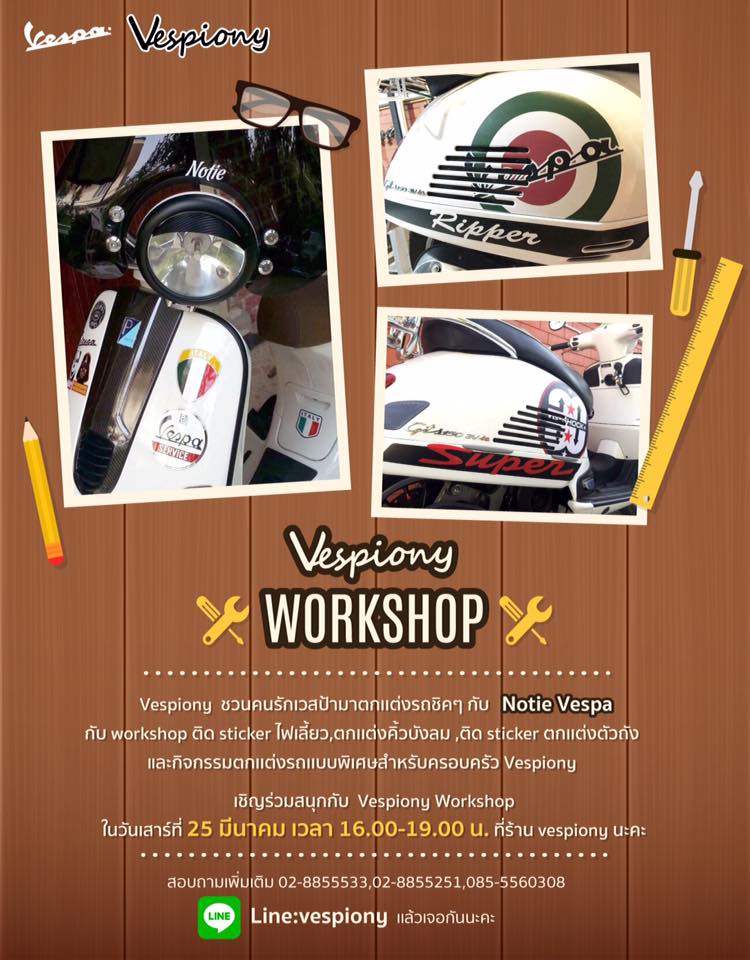 Vespiony Workshop ขอชวนชาวเวสป้ามาตกเเต่งรถชิคๆกับ Notie Vespa กับ workshop ติด sticker ไฟเลี้ยว, ตกเเต่งคิ้วบังลม ,ติด sticker ตกเเต่งตัวถัง เเละกิจกรรมตกเเต่งรถเเบบพิเศษสำหรับครอบครัว vespiony