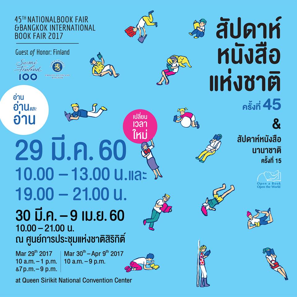 เตรียมพบกับหนังสือดีๆ ทั้งในประเทศและต่างประเทศในงานสัปดาห์หนังสือแห่งชาติ ครั้งที่ 45 และสัปดาห์หนังสือนานาชาติ ครั้งที่ 15 ในคอนเซ็ปต์ “อ่าน อ่าน และอ่าน” ซึ่งจัดโดยสมาคมผู้จัดพิมพ์และผู้จำหน่ายหนังสือแห่งประเทศไทย ระหว่างวันที่ 29 มีนาคม – 9 เมษายน 2560 ณ ศูนย์การประชุมแห่งชาติสิริกิติ์