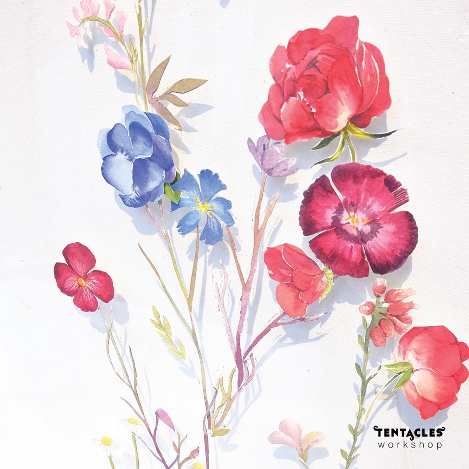 ฝึกวาดดอกไม้ใบหญ้าและนำมาคอลลาจลงบนแผ่นอะคริลิกใส สนุกสนานกับการเปลี่ยนพื้นหลังตามพื้นที่ที่จัดวาง เกิดความลึกและเงาที่เปลี่ยนไปตามช่วงเวลา เรียนรู้ทั้งสีน้ำและการจัดวางองค์ประกอบของภาพ ศาสตร์ของการคอลลาจ หนีไอร้อนในเดือนเมษาและมาวาดรูปที่เทนทาเคิลด้วยกัน ราคา 1,900 บาท (รวมอุปกรณ์ให้ใช้ในวันเวิร์คช็อปและแผ่นอะคริลิก)
