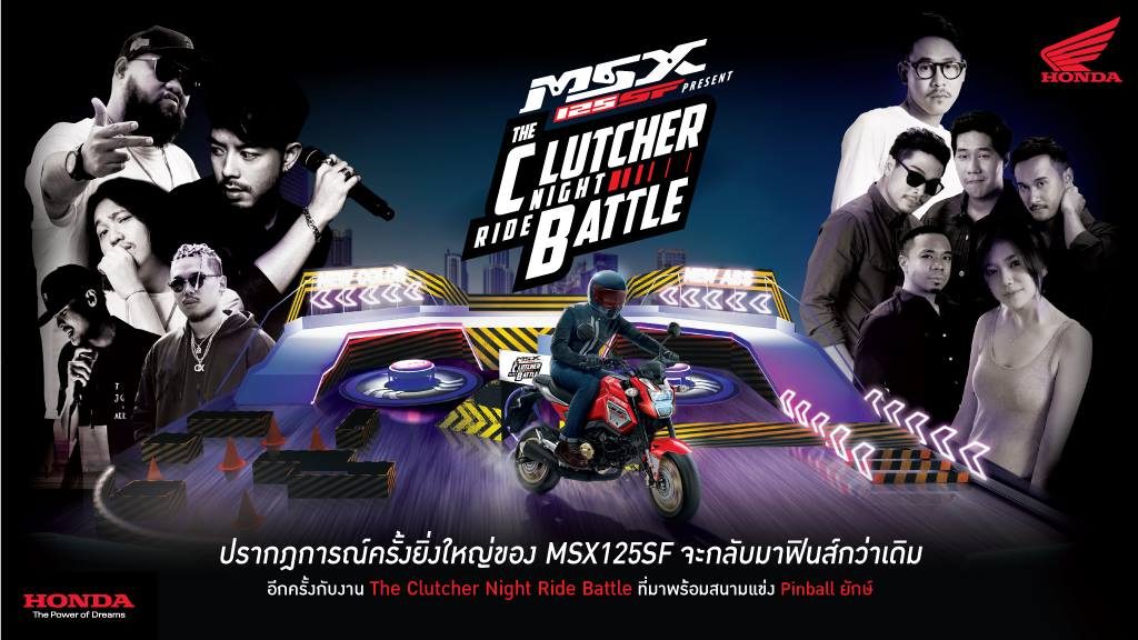 ปรากฏการณ์ครั้งยิ่งใหญ่ของ HONDA MSX125SF จะกลับมาฟินส์กว่าเดิม ขอเชิญคุณมาเป็นส่วนหนึ่งของปรากฏการณ์ NIGHT TRACK สุดยิ่งใหญ่อีกครั้ง กับงาน The Clutcher Night Ride Battle ที่มาพร้อมสนามแข่งขัน Pinballยักษ์ จัดเต็มแสงสีเสียง ที่ผู้แข่งขันต้องวางแผนและใช้สกิลการขับขี่ เพื่อชิงความเป็น1 พร้อมฟินส์ไปกับ Celeb ชื่อดัง ทั้ง ดีเจภูมิ ดาร่า Biker สาวสุดฮอต และ Concert สุดมันส์จาก กวาง AB NORMAL ,The Musketeer, หลุยส์ RAP IS NOW, กอล์ฟ ฟักกลิ้งฮีโร่