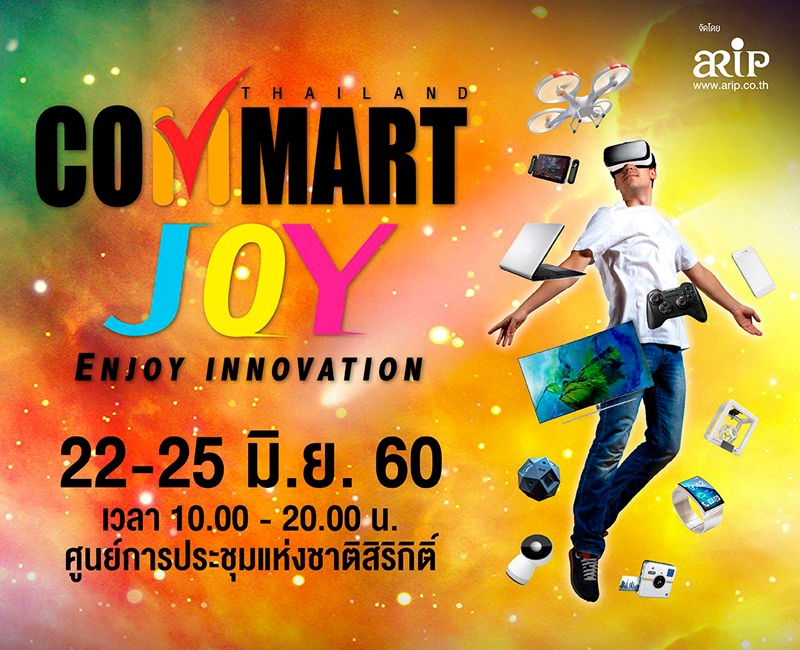 พบกับโลกแห่งความบันเทิงไฮเทคและเกมส์ สนุกสุดขีดแบบชีวิตดิจิตอล ในงาน Commart Joy 2017 ตั้งแต่ 22-25 มิถุนายน 2560 เวลา 10.00 – 20.00 น. ณ ศูนย์การประชุมแห่งชาติสิริกิติ์ Arip ร่วมกับแบรนด์สินค้าและบริการไอซีทีชั้นนำ จัดงานแสดงนวัตกรรมและจำหน่ายสินค้าไอซีทีครั้งยิ่งใหญ่ ซึ่งครั้งนี้เป็นงานกลางปีที่นอกจากจะอัพเดตเทคโนโลยีล่าสุดของครึ่งปี 2560 แล้ว ยังมีโซนและกิจกรรมล้ำๆ มากมาย อาทิ Technotainment World โลกแห่งความบันเทิงไฮเทคและเกมส์ สุขแบบชีวิตดิจิทัล, Home Electric Super Sale by Home Pro & The Power ช้อปคุ้มวนไป…กับเครื่องใช้ไฟฟ้า โปรโมรชั่นจัดเต็ม