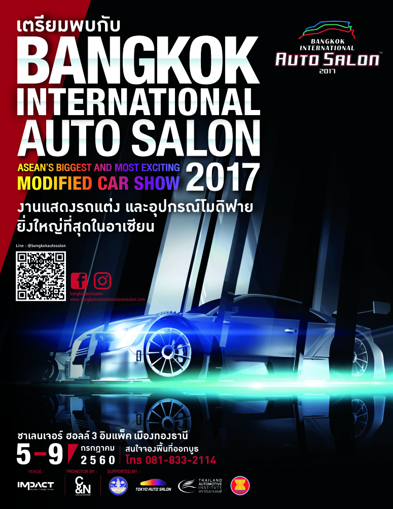 งาน บางกอก อินเตอร์เนชั่นแนล ออโตซาลอน 2017 งานจำหน่ายรถยนต์ตกแต่งพิเศษและอุปกรณ์โมดิฟายใหญ่ที่สุดของประเทศไทยและอาเซียน ครั้งที่ 5 ระหว่างวันที่ 5-9 กรกฎาคม ณ ชาเลนเจอร์ ฮอลล์ 3 อิมแพค เมืองทองธานี จัดโดย บริษัท คอร์โนแอนด์แนช จำกัด ในเครือ บริษัท สยามสปอร์ต ซินดิเคท จำกัด (มหาชน) ผนึกกำลังค่ายรถยนต์และค่ายอุปกรณ์โมดิฟายชุดแต่งชั้นนำระดับโลก ไฮไลท์สุดยอดรถแต่งที่ได้รับรางวัลจากงาน โตเกียว ออโต ซาลอน ประเทศญี่ปุ่น พบค่ายรถยนต์ชื่อดังและสินค้ายานยนต์ราคาพิเศษ และความบันเทิงสุดเร้าใจจากต่างประเทศ