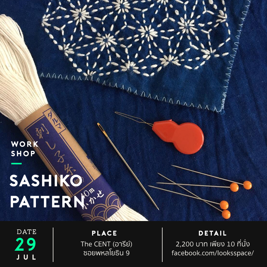 คลาส “ปักผ้าสไตล์ญี่ปุ่น” (Sashiko Pattern) เรียนรู้การปักผ้าแบบญี่ปุ่นโบราณ สร้างสรรค์ด้วยลวดลายพื้นฐานสไตล์ซาชิโกะ ปักลงบนผ้าย้อมครามตัดกับเส้นด้ายสีขาว เรียนจบนำพื้นฐานไปต่อยอดได้อีกมากมาย สอนโดยครูต่าย ผู้รักในงานฝีมือและฝึกฝนตนเองทำงานฝีมือจนเชี่ยวชาญ