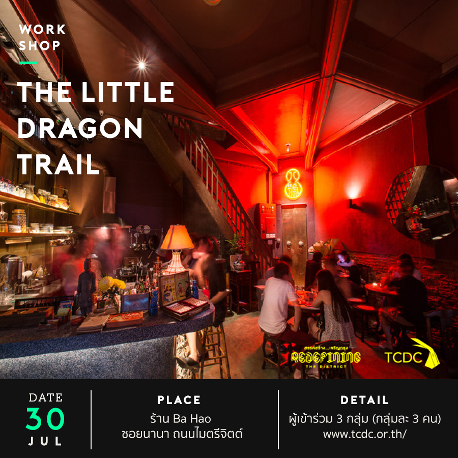 เวิร์กช็อป “The Little Dragon Trail” กับ Ba Hao (ปา เฮ่า) บ้านเลขที่ 8 เลขมงคลของชาวจีนที่ตั้งอยู่มุมซอยนานา ถนนเยาวราช จากห้องแถวเก่าถูกออกแบบใหม่ให้เป็นบาร์สไตล์จีนและที่พักสำหรับผู้มาเยือน การตกแต่งที่เลือกเก็บรักษารายละเอียดของอาคารเดิมที่สวยงามเอาไว้ให้คงเดิม พร้อมด้วยอาหารจีนคอมฟอร์ทฟู้ดและเครื่องดื่มหลากหลาย ความโดดเด่นด้านเมนูอาหารและรสชาติของปา เฮ่า นำมาสู่เวิร์กช็อปการทำอาหาร ทีมปา เฮ่า จะชวนผู้เข้าร่วมกิจกรรมมาออกแบบและลงมือทำ Chinese Stuffed Flat Bread (Bing) ในแบบฉบับของตนเอง เริ่มตั้งแต่ซื้อวัตถุดิบจากย่านเยาวราชจนถึงเข้าครัวทำเป็นจานพร้อมเสิร์ฟ
